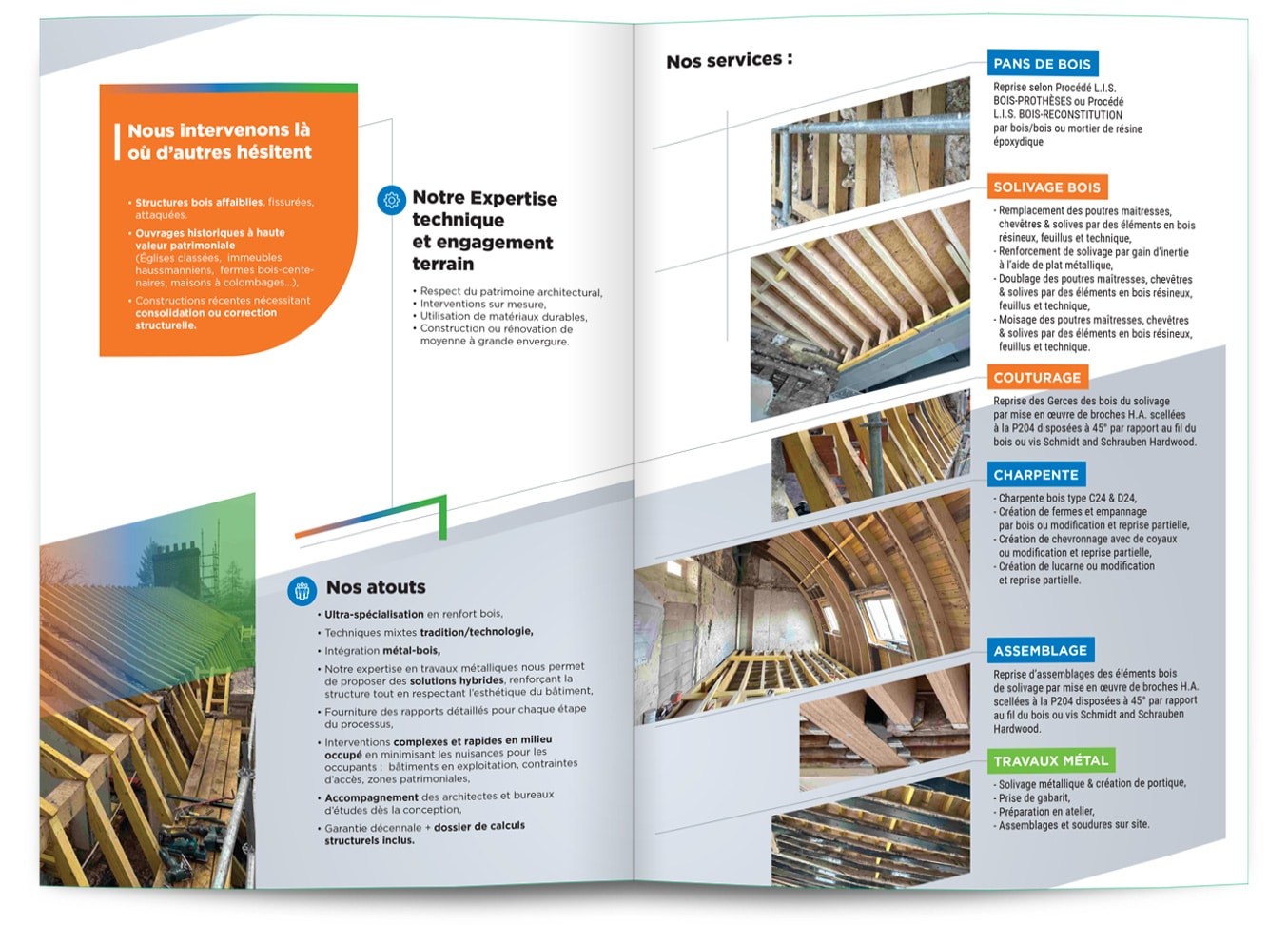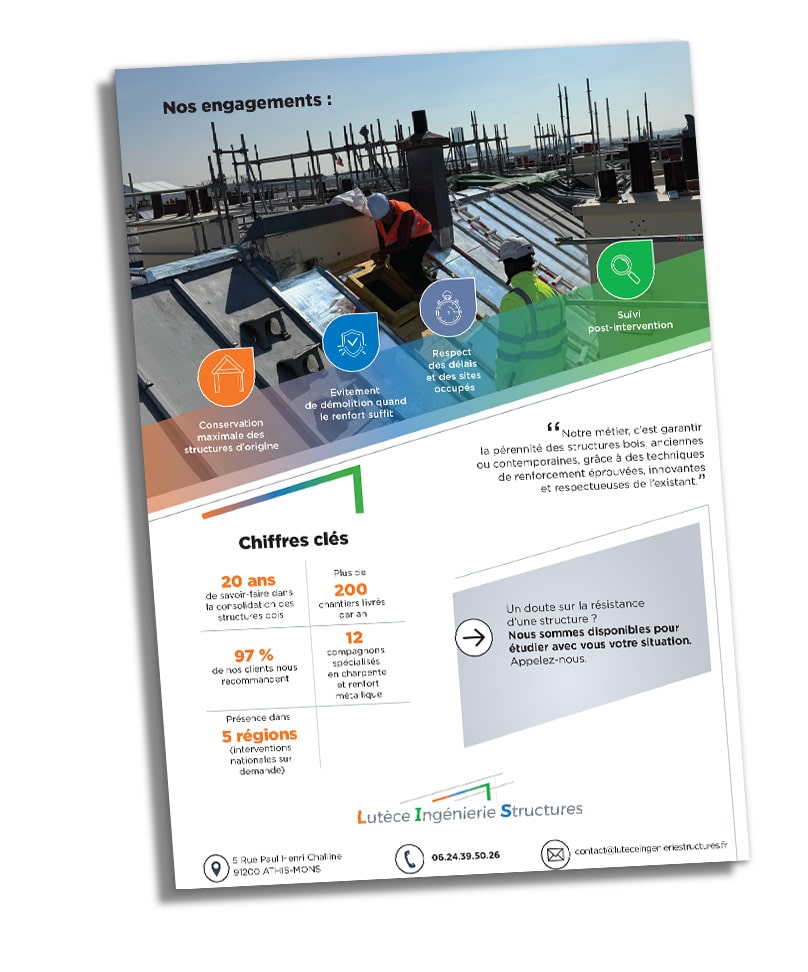 Nous sommes fiers de vous présenter la plaquette commerciale d’une entreprise du bâtiment réalisée pour Lutèce Ingénierie Structures, spécialisée dans le renforcement des structures bois et métal. Cette création reflète parfaitement leur expertise technique et leur engagement dans la préservation du patrimoine architectural.